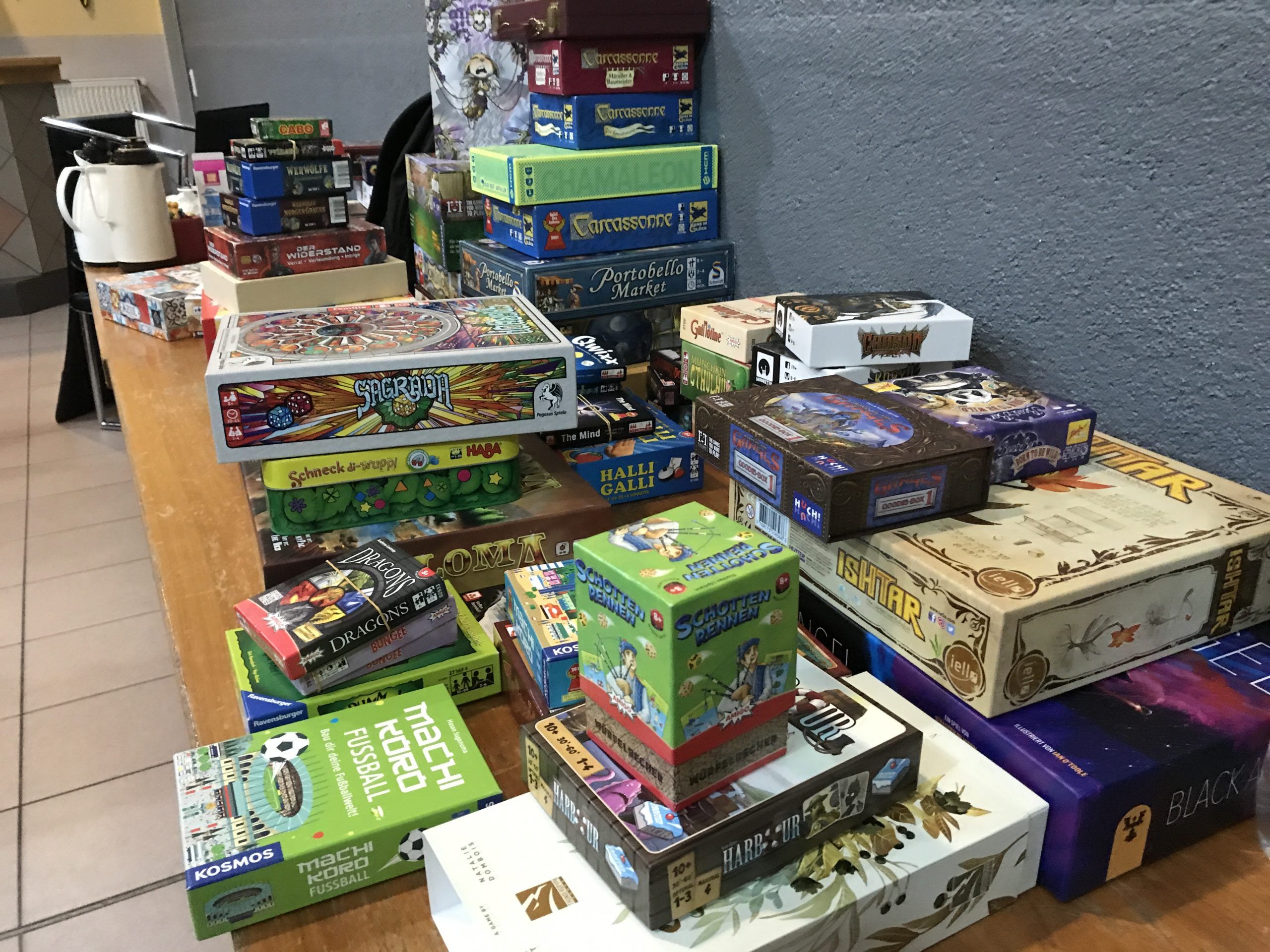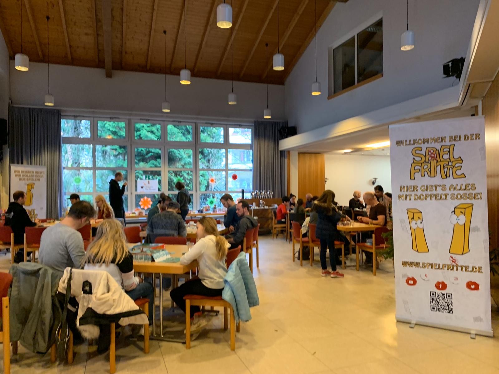 Ja, anders kann man es nicht sagen: DIE BUDE WAR VOLL! Sehr voll sogar. Ich zählte um die 55 Menschen, und da waren längst nicht alle aufgezählt. Damit haben wir bestimmt die 60 erreicht. Alle Tische waren besetzt, so dass sogar aus dem Kabuff noch weitere Tisch rangekarrt werden mussten. Und diese wurden schon recht schnell mit Spielen bedeckt.