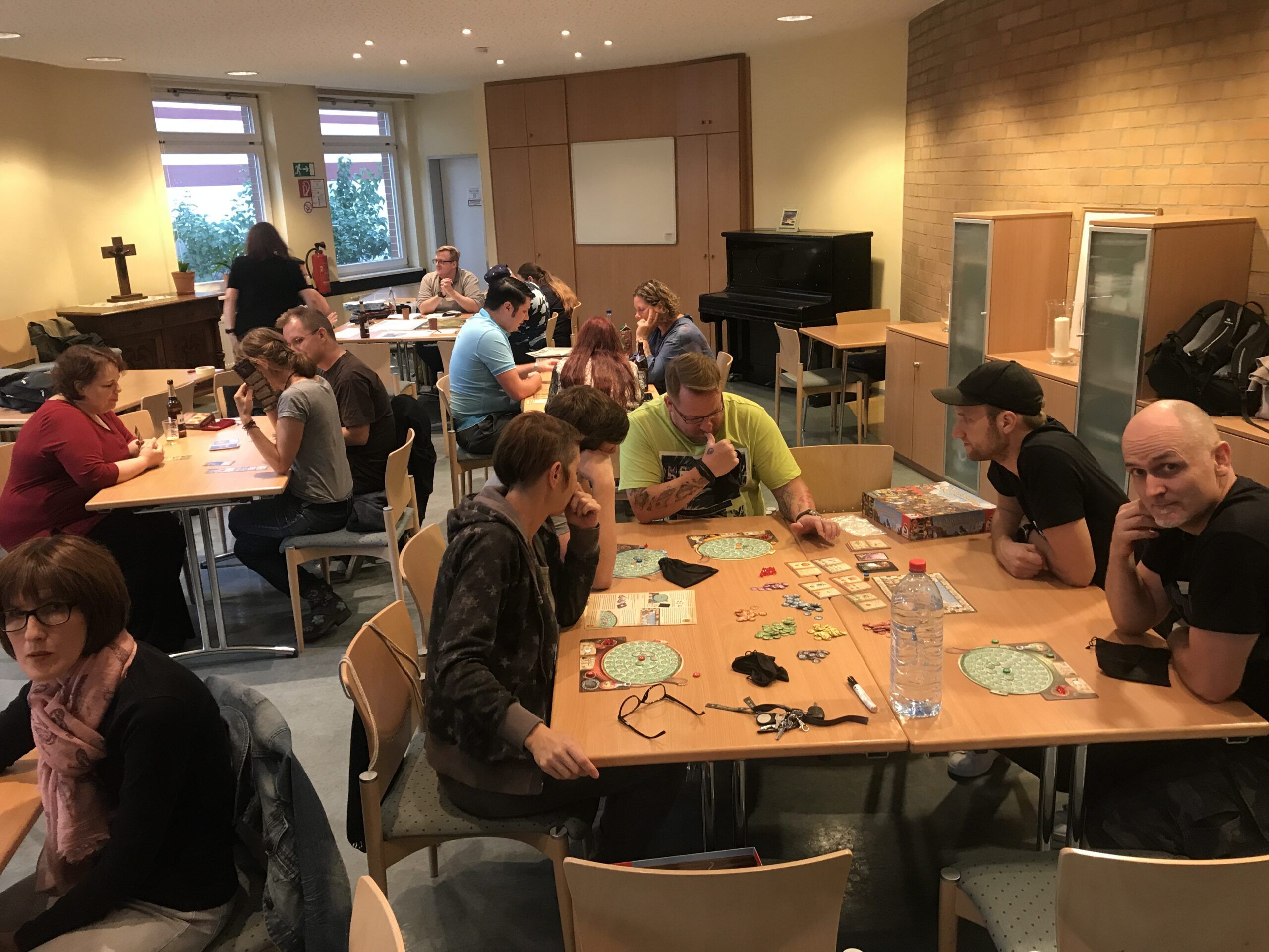 Es war wieder mal richtig voll in der Kreuzstrasse. Als ich zum Zählen einmal durch die Räume ging, zählte ich schon wieder über 40 Menschen, die zusammenkamen, um die Bretter der Spielewelt zu erkunden. Und wieder wurde fleißig gespielt, und wieder kamen Neuheiten auf den Tisch, und wieder wurden neue Menschen an die Tische eingeladen. Wirklich für alle war was dabei, und Neues, wie auch Altes kam auf die Tische.