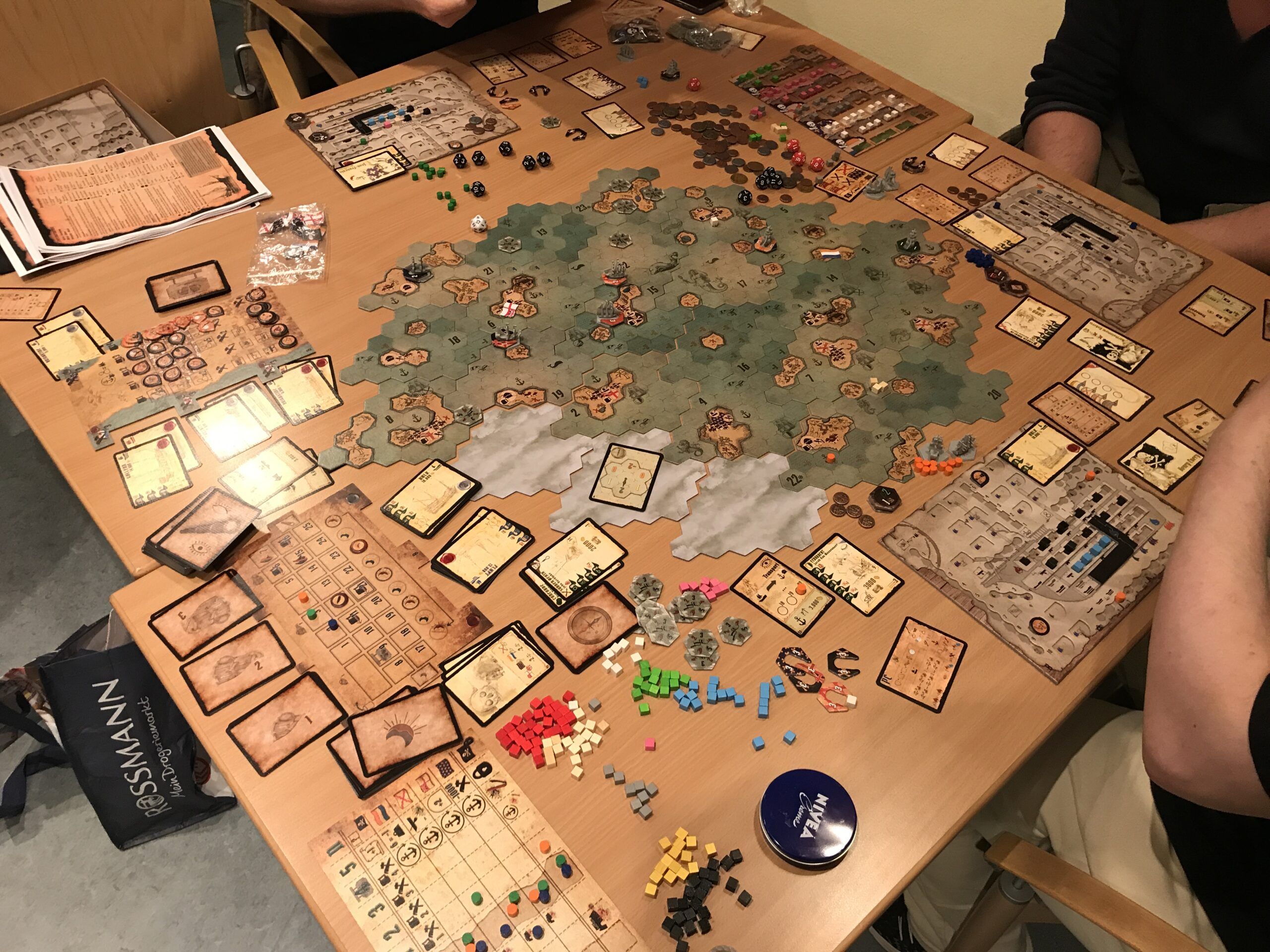 Viele Taschen waren gefüllt mit Spielen und diese wurden reichhaltig gespielt. Währen an manch Tischen eher leichtes und zugängliches Spiel gespielt wurde, so bauten an wieder anderen Tischen so manch Menschen richtige Klopper auf. Ihr könnt gerne in der Bildergalerie schauen, was alles (und noch mehr) an diesem einem Abend alles auf die Tische kam.