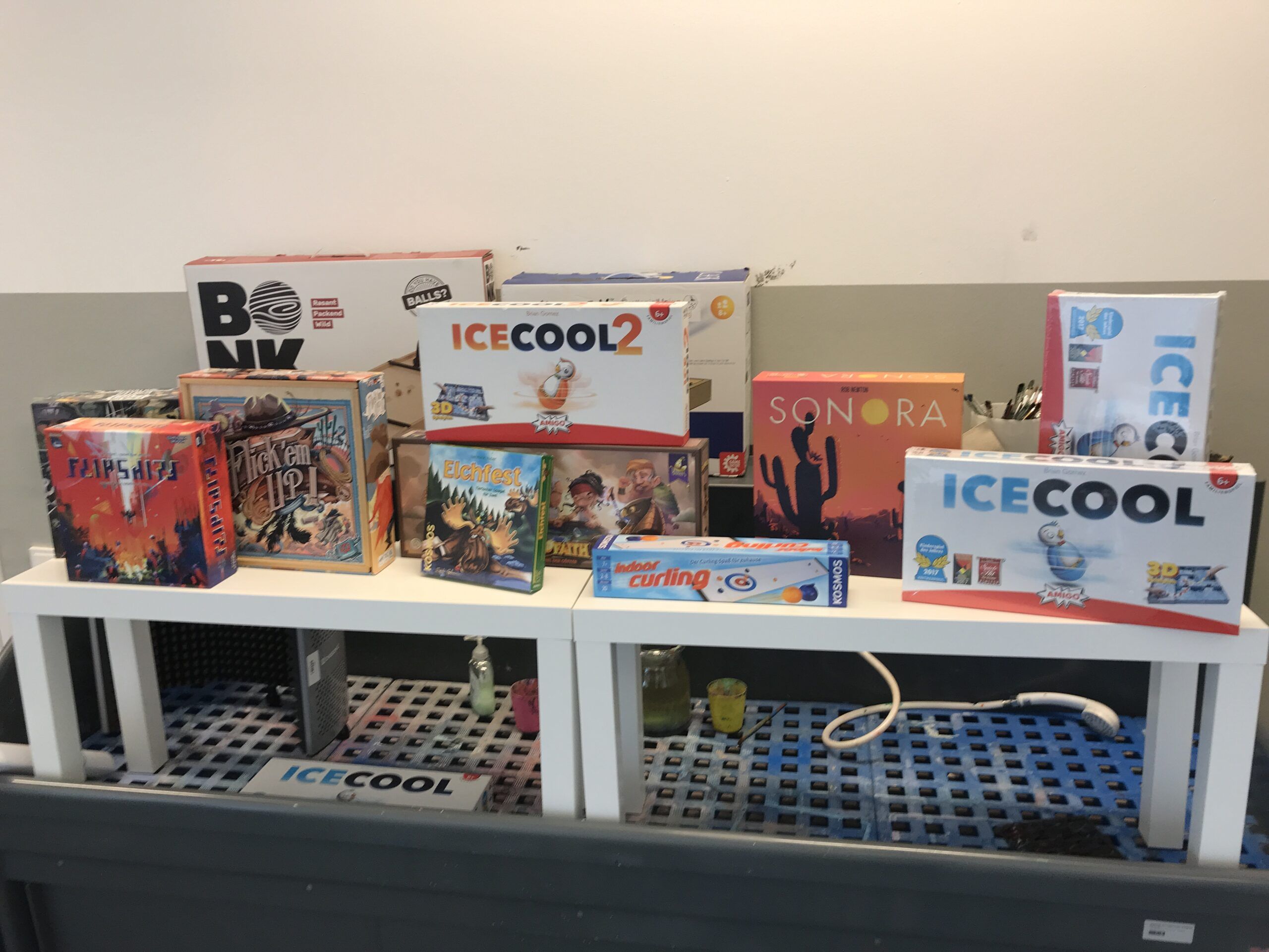 Einige Spiele wurden gleich ausgebaut, da sie sicherlich von eher jüngeren Menschen gleich gespielt werden wollten. Spiele wie ICECOOL, Klask, Super Rhino Hero Battle, Pinguine, Drop It und viele weitere machten den Start. Und wie prophezeit, wurden auch diese Spiele gleich von der ersten Gruppe Grundschüler*innen in Beschlag genommen. Wild, verspielt, laut und lebhaft wurden Bälle gestoßen, Aufgaben geknobelt, Pöppel geflitscht und Karten gekloppt und Würfel geworfen.