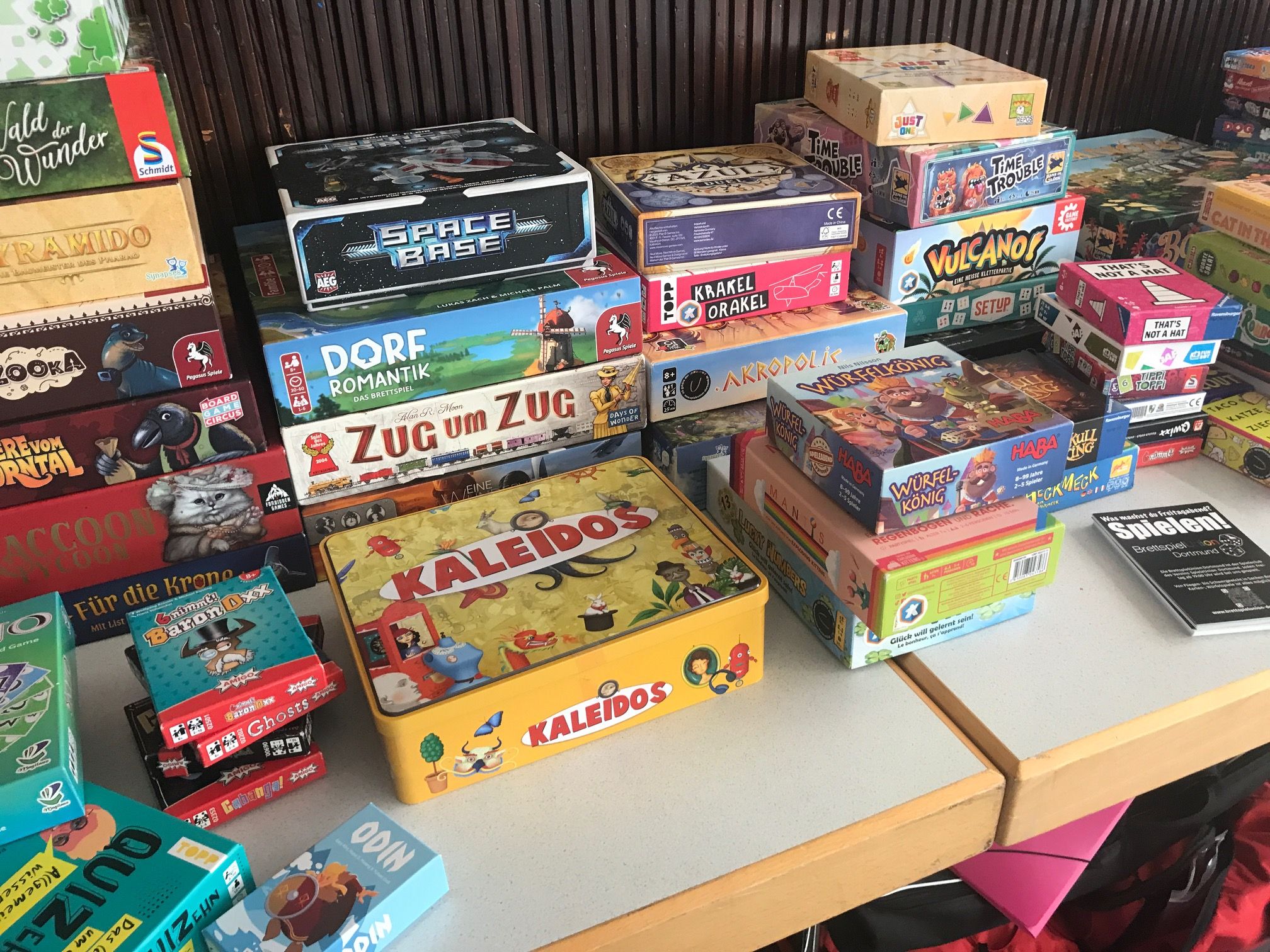 Seit 1979 sind es eine Vielzahl an Titel geworden. Der rote Pöppel (Spiel des Jahres) zieht seitdem jedes Jahr ein neues Spiel, und die Verkaufszahlen gehen mit dem Siegel durch die Decke. Zu dem Spiel des Jahres gesellte sich auch der blaue Pöppel, das Kinderspiel des Jahres, und der anthrazitfarbene Pöppel, der das Kennerspiel des Jahres auszeichnet. Alle Preisträger hatten wir im Gepäck und konnten gespielt werden.